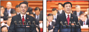 Zhou Qiang (left), SPC president, and Cao Jianming, procurator-general of the SPP, deliver speeches.Xu Jingxing / China Daily |